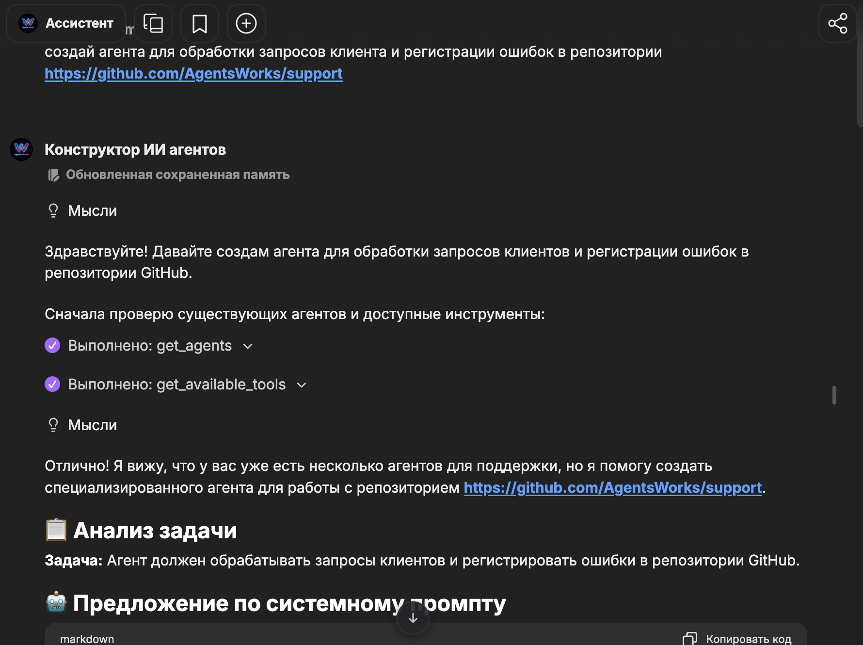 Для создания команды ИИ агентов мы воспользовались нашим универсальным ИИ агентом. Просто описали поведение и он сам создал ИИ ассистентов.