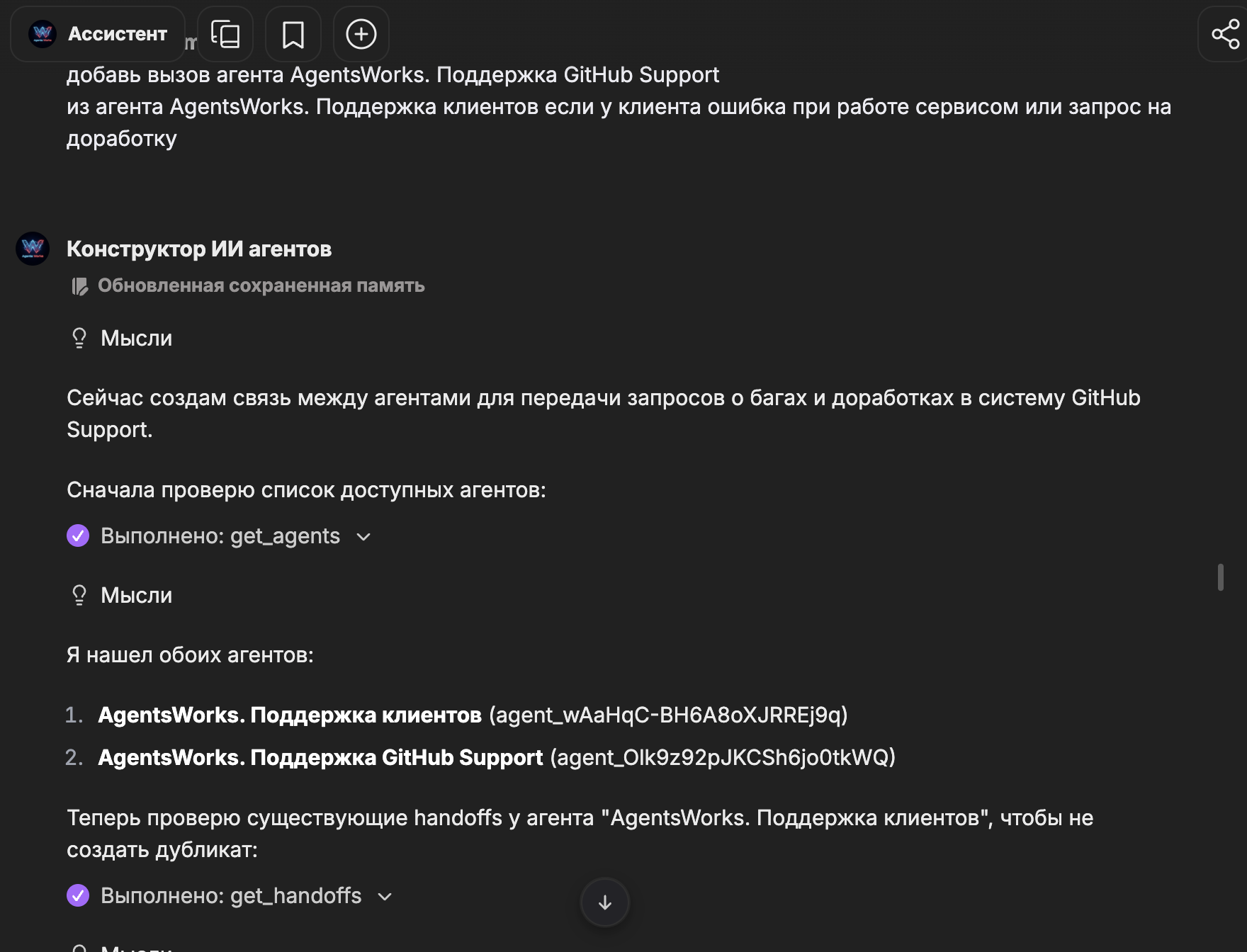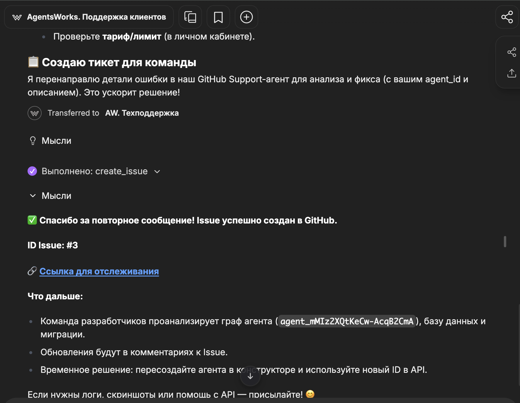 Сообщение об ошибке или запрос на доработку — агент автоматически передает управление агенту "AgentsWorks. Техподдержка" с контекстом запроса клиента